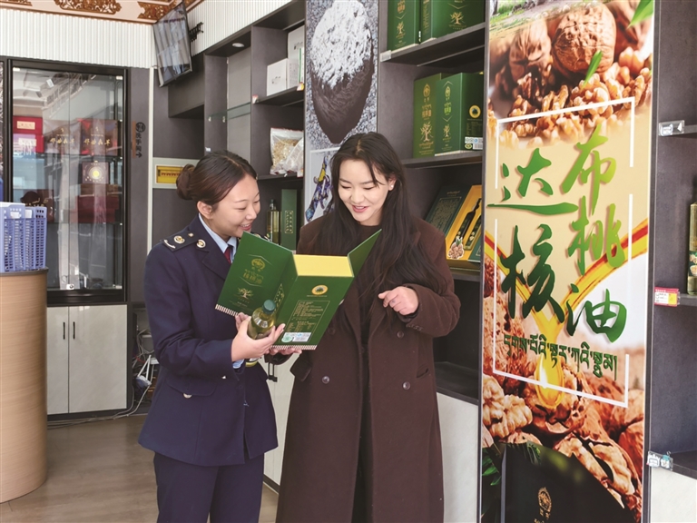 工作人员向税务干部介绍核桃油。通讯员 吴轩 摄 在山南市加查县安饶镇嘎玉村的“世界最大规模的千年核桃林”里,3600余株树龄超过500年的古核桃树静静矗立着。凭借古核桃树群落资源,加查县政府与长江大学携手合作,成立了“...