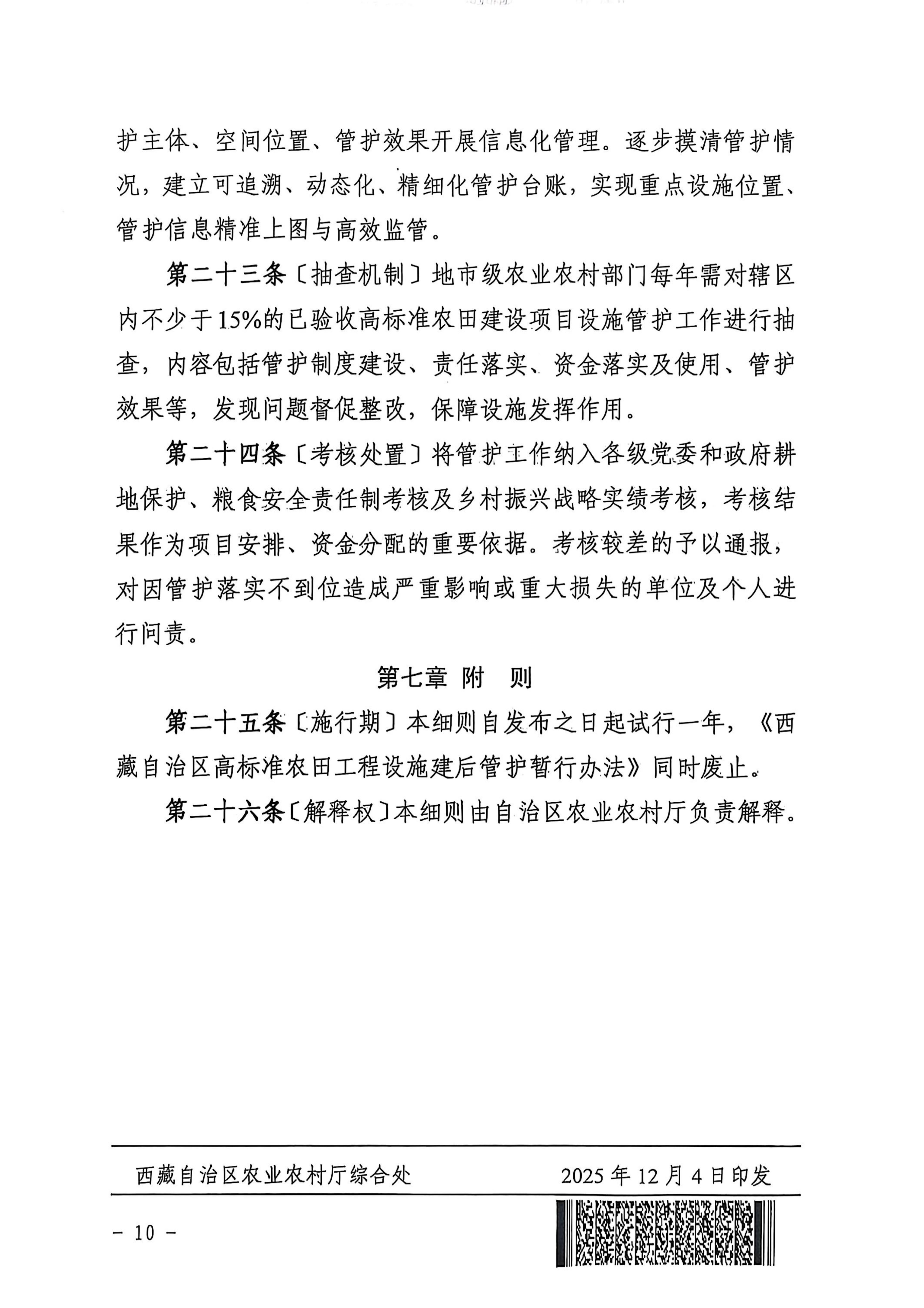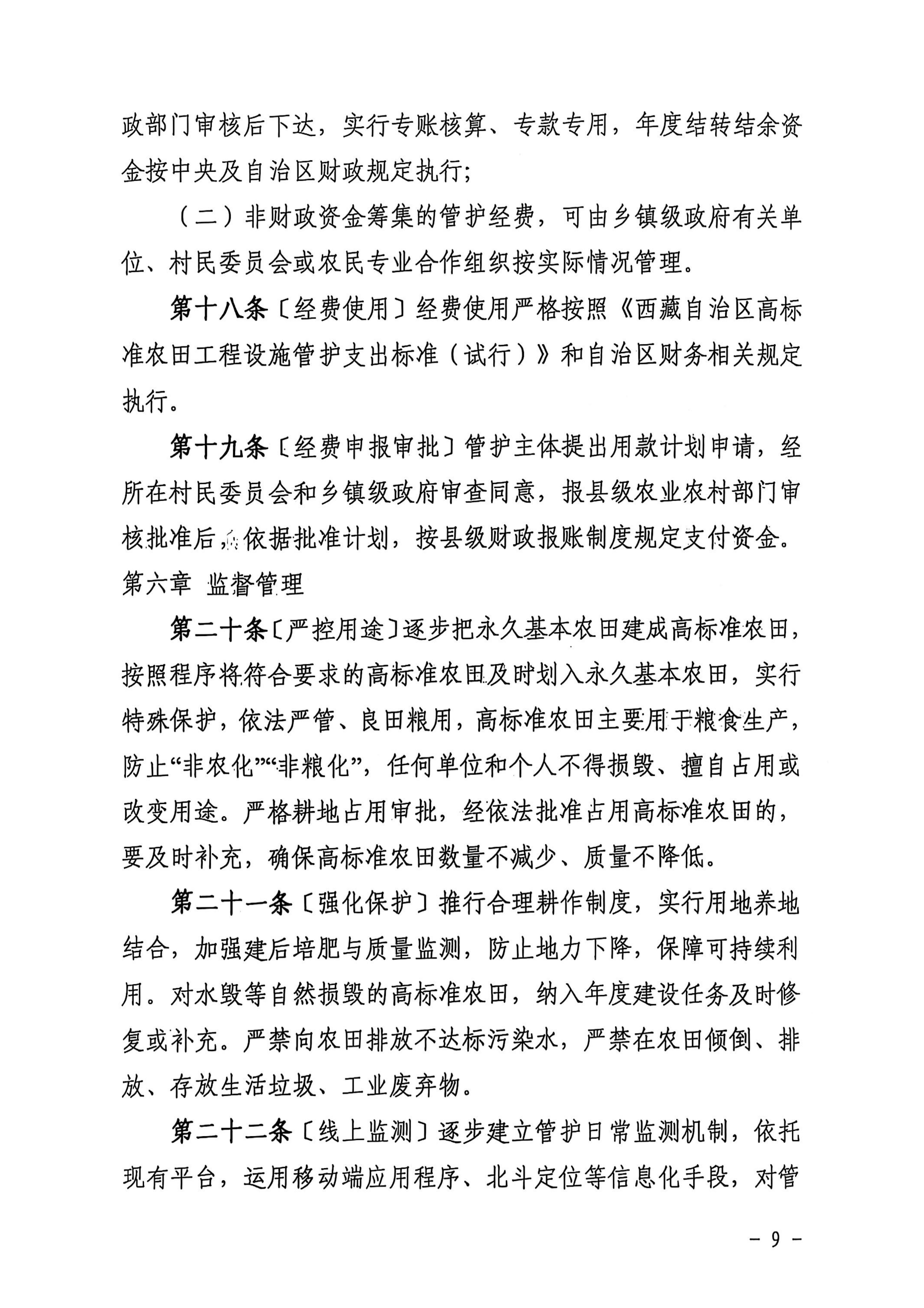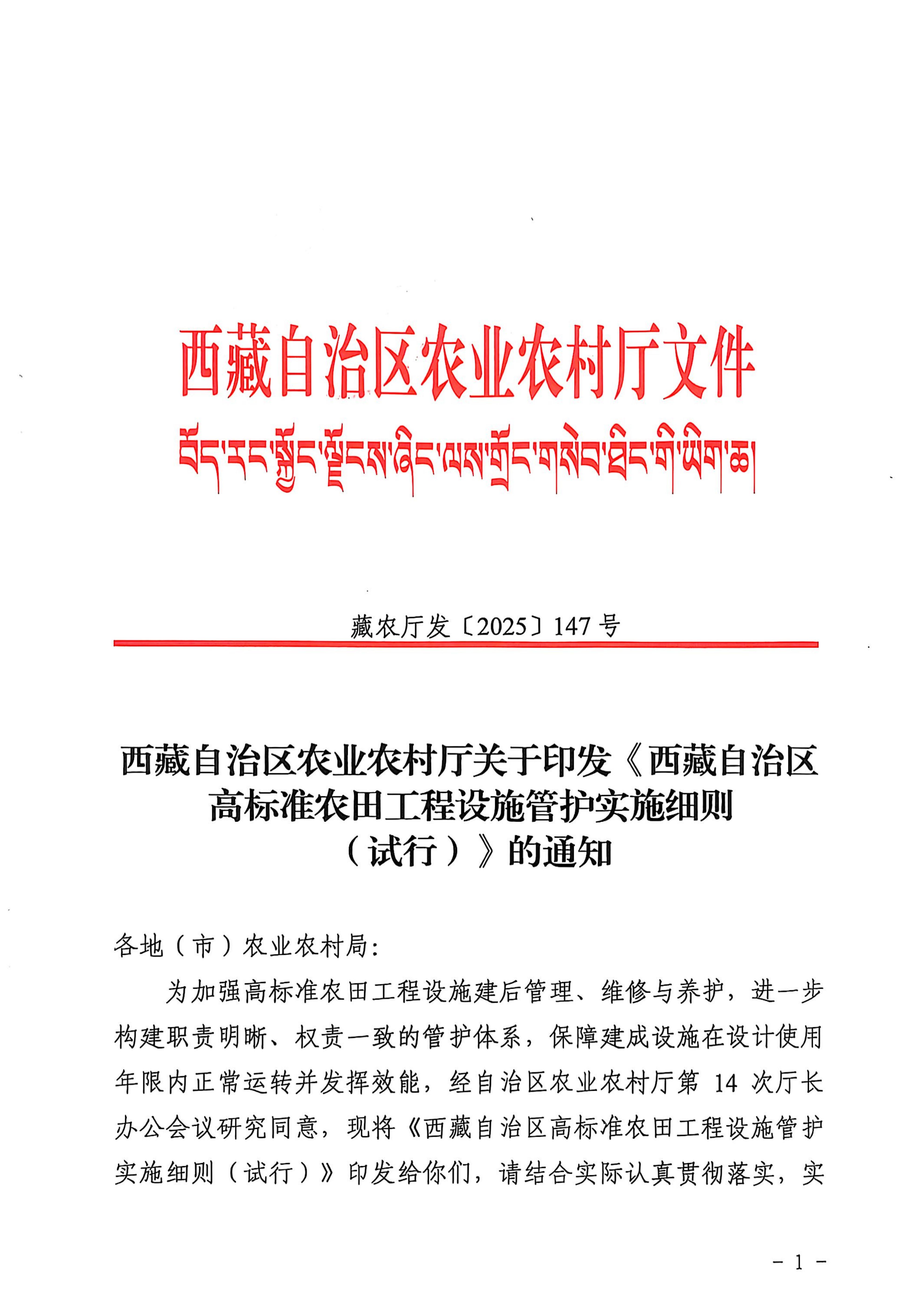 西藏自治区农业农村厅关于印发《西藏自治区高标准农田工程设施管护实施细则(试行)》的通知