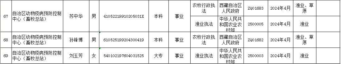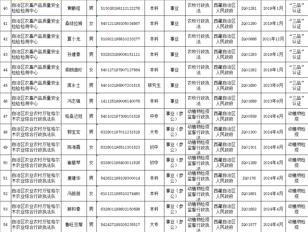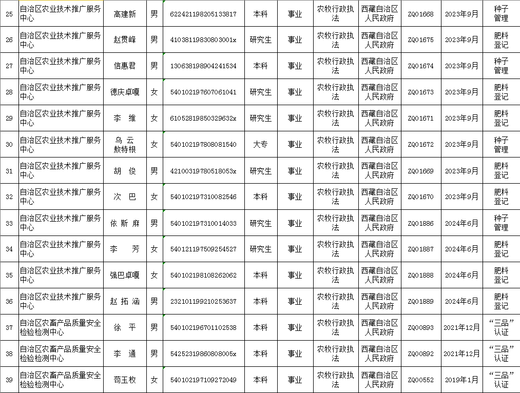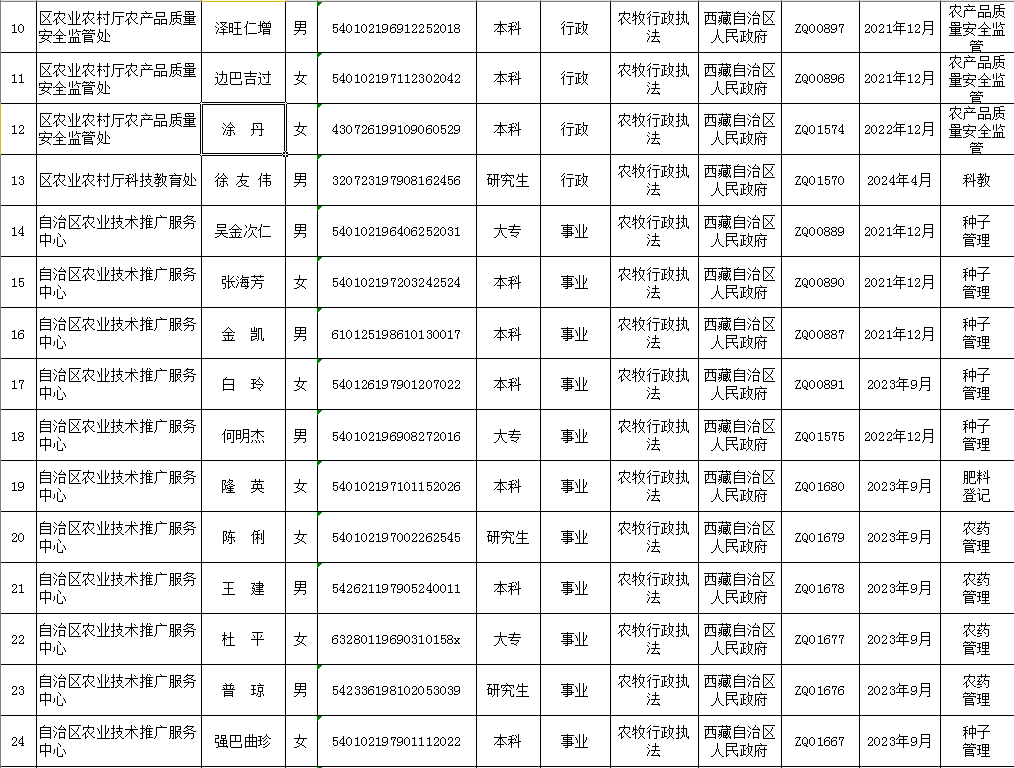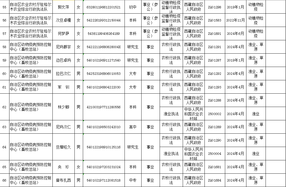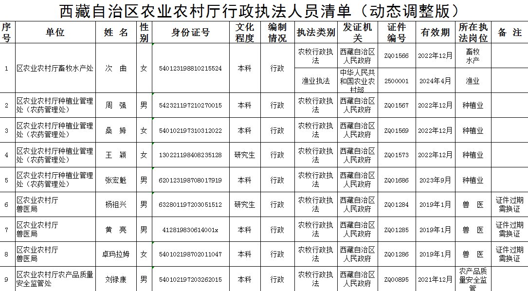 西藏自治区农业农村厅行政执法人员清单(动态调整版)