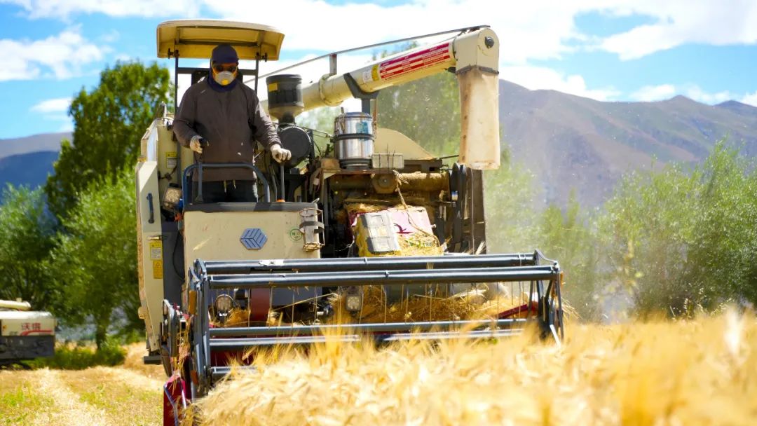 在白朗县嘎东镇马义村,金色的田野里阿久们(意为大哥)开着联合收割机、拖拉机、电动三轮车来回穿梭,收割、摘穗、运输……现场一片繁忙景象。