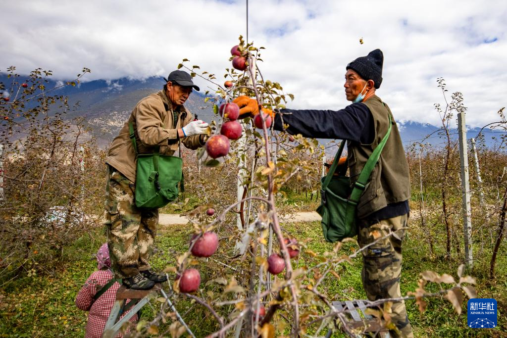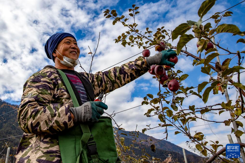 米林市羌纳乡西藏林芝现代苹果标准化园区内,农民在采摘苹果(11月13日摄)。新华社记者 姜帆 摄