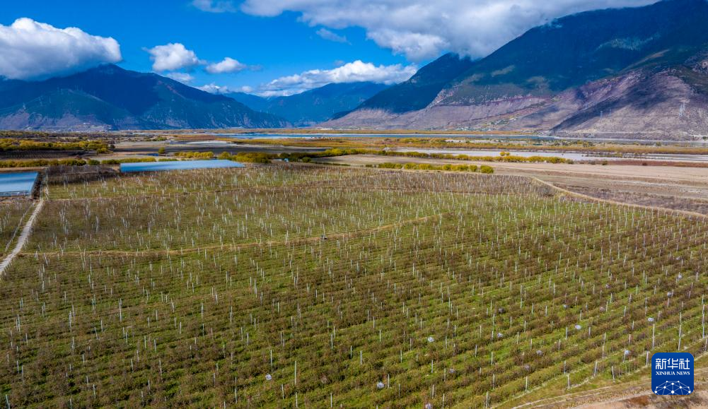 鸟瞰米林市羌纳乡西藏林芝现代苹果标准化园区(无人机照片,11月13日摄)。新华社记者 姜帆 摄