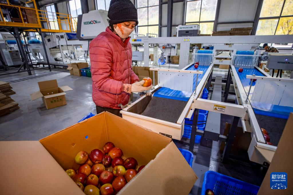 米林市羌纳乡西藏林芝现代苹果标准化园区分拣车间内,工人在流水线上分拣苹果(11月13日摄)。新华社记者 姜帆 摄