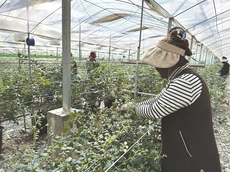 “您看这棵已开花,说明需要调低温度,温度高了蓝莓容易开花,开花过快会影响果实收成。”基地技术员措姆向记者介绍,“我毕业于华中农业大学农业资源与环境专业,蓝莓种植基地建成后,就来到这里。专业对口,工作稳定,我很喜欢现在的工作。”