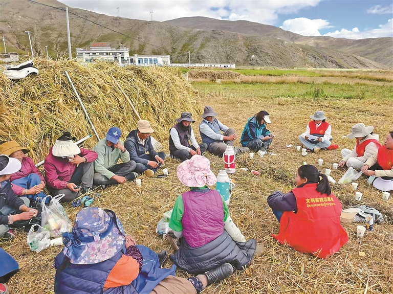 看到这场景,哈西社区的普布刚组主动喊上邻居帮老人次仁顿旦收粮:“志愿者帮我们收粮,我们更该互帮互助。”如今,浪卡子全镇已有80余户自发加入互助队伍,“红色身影”带动“群众身影”,田间地头处处涌动着暖心画面。