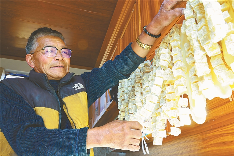 图为墨竹工卡县工卡镇格桑村奶牛良种养殖户挡桑晾晒奶渣。记者 黄志武 通讯员 洛克 摄