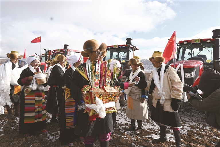紧随其后,翻土机、整土机、碎土机依次发动,轰鸣声响彻田间,铁犁滚滚翻起新泥,现代农机的高效与传统耕作的仪式感相映成趣,勾勒出春堆村农业发展的新图景。“现在种地太省心了,通路通电通网,无人机播种、施肥都成了常态,再也不用靠蛮力干活。”村民吉吉笑着说,更让大家安心的是,自从和西藏阿拉嘉宝酒业有限责任公司(以下简称西藏阿拉嘉宝酒业)搭上了线,自家种的青稞再也不愁销路。“粮食能卖上好价钱,心里就有底。”吉吉说。