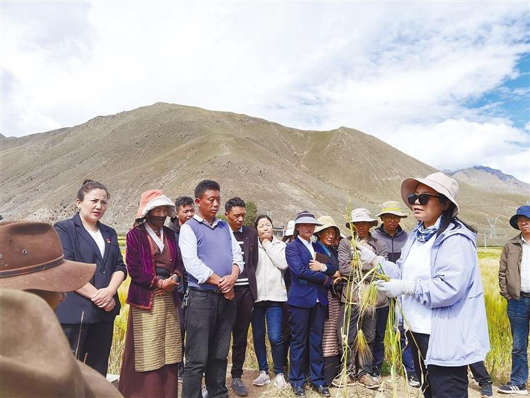 图为日喀则市农牧业科学研究推广中心农艺师德吉央宗(右二)深入田间地头现场讲解杂株杂草防治技术及辨别方法。 记者 扎西顿珠 摄