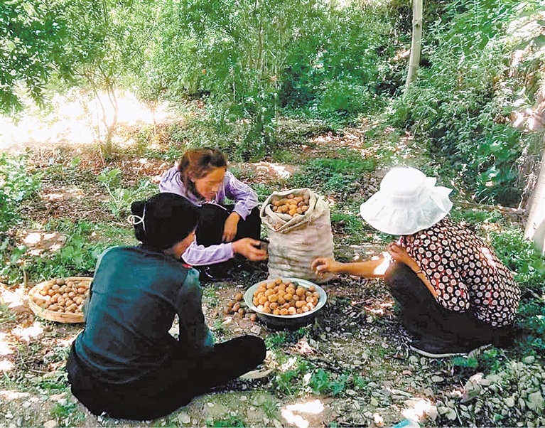 图为左贡县村民们正在收核桃。记者 万慧 摄