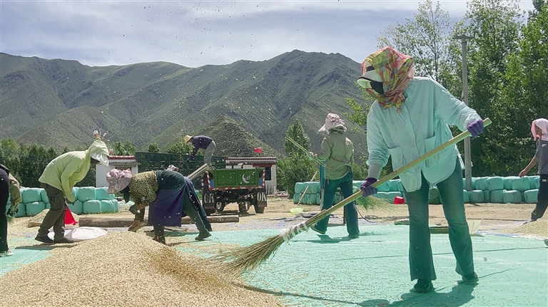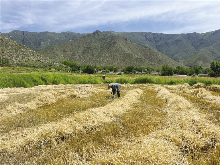 “今年我家种了12亩青稞,家中四口都在忙着秋收,我们村是统一由机械收割,收割起来很轻松。”村民德庆卓嘎激动地说道。