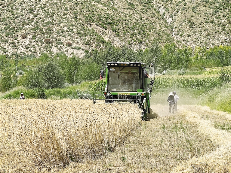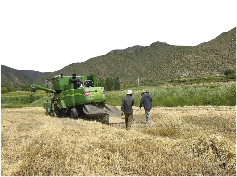 走进曲水县茶巴朗村青稞田,一台台大型联合收割机忙碌地穿梭其间。村民正趁着晴好天气,抓紧时间收割青稞,金黄色的青稞随着机械的推进迅速倒下,饱满的颗粒通过传送带直接装入运粮车中。