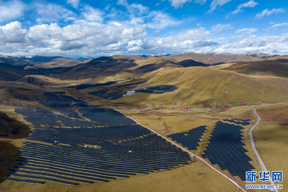 10月19日拍摄的华电西藏江达牧光互补光伏发电项目。该项目位于西藏自治区昌都市江达县青泥洞乡索日村,总装机20兆瓦,每年可发出清洁电能3000万千瓦时,可减少二氧化碳排放3万吨。新华网 旦增努布 摄
