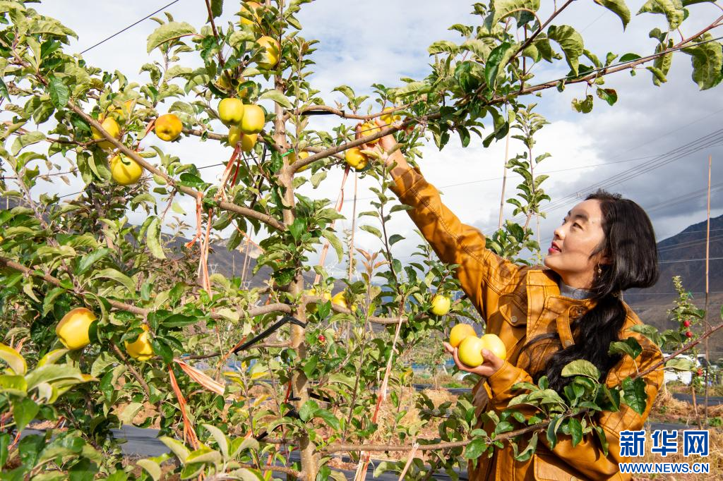 10月12日,西藏昌都市八宿县白玛镇沙木村村民嘎桑曲珍在苹果园区采摘。该园区于2023开始陆续挂果,预计2025年进入丰产期,今年园区苹果产量达140余吨左右。目前全县种植苹果35万余株,总面积4848.95余亩。新华网 旦增努布 摄