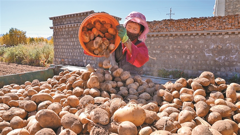 南木林县艾玛乡群众正在将收获的土豆集中装车。