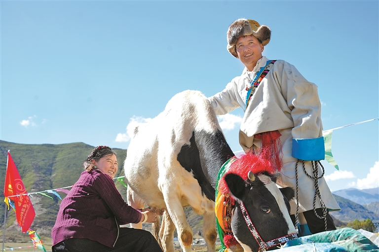 萨迦县庆祝2025年中国农民丰收节系列活动中的奶牛挤奶比赛现场。