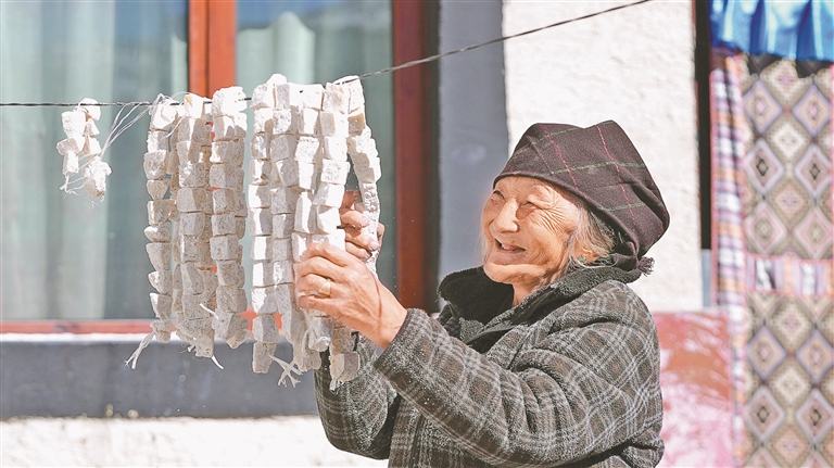 墨竹工卡县日多乡拉龙村一位老人在晾晒奶渣。