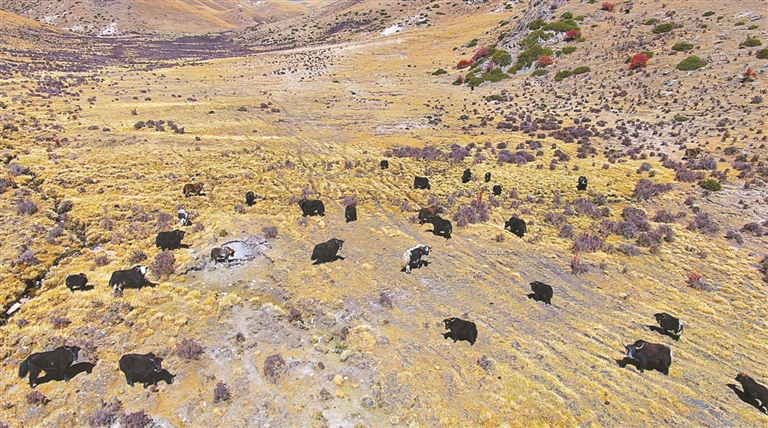 墨竹工卡县日多乡拉龙村4组的牧场上,牦牛在悠闲地吃草。记者 格桑伦珠 摄