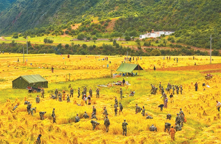 图为昌都军分区官兵帮助约日村村民秋收,欢声笑语中,尽显军民鱼水深情。周楚竣 摄