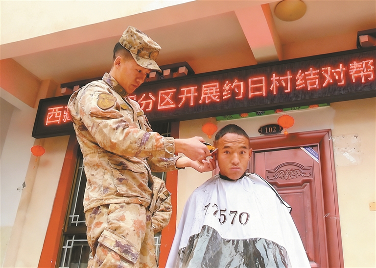 图为昌都军分区官兵在给约日村村民理发。周楚竣 摄