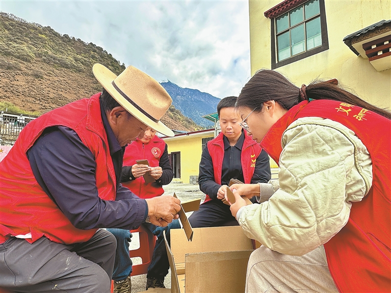 图为墨脱县格当乡党员干部帮助村民制作包装盒。记者 王敏 通讯员 郎玲 摄