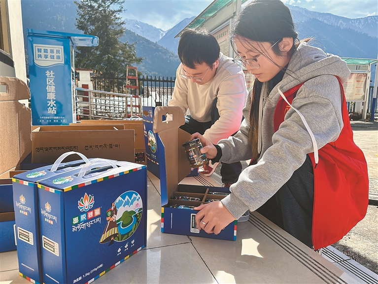 图为墨脱县格当乡党员干部将辣椒酱装箱。记者 王敏 通讯员 郎玲 摄