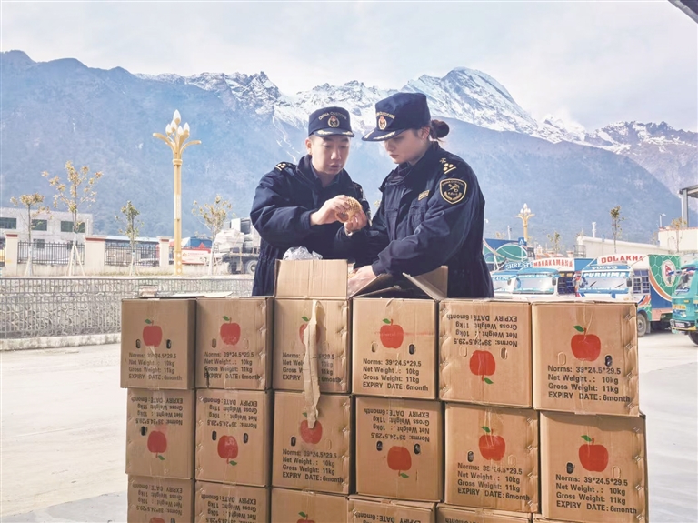 在吉隆口岸联检大楼,海关关员紧紧盯着X光机显示屏,常年深耕一线练就的“火眼金睛”锐利如炬,不放过任何一件入境行李物品、任何一处隐藏细节疑点,截获台上整齐摆放着水果、奶酪等禁止携带入境物品,等待进一步处置。