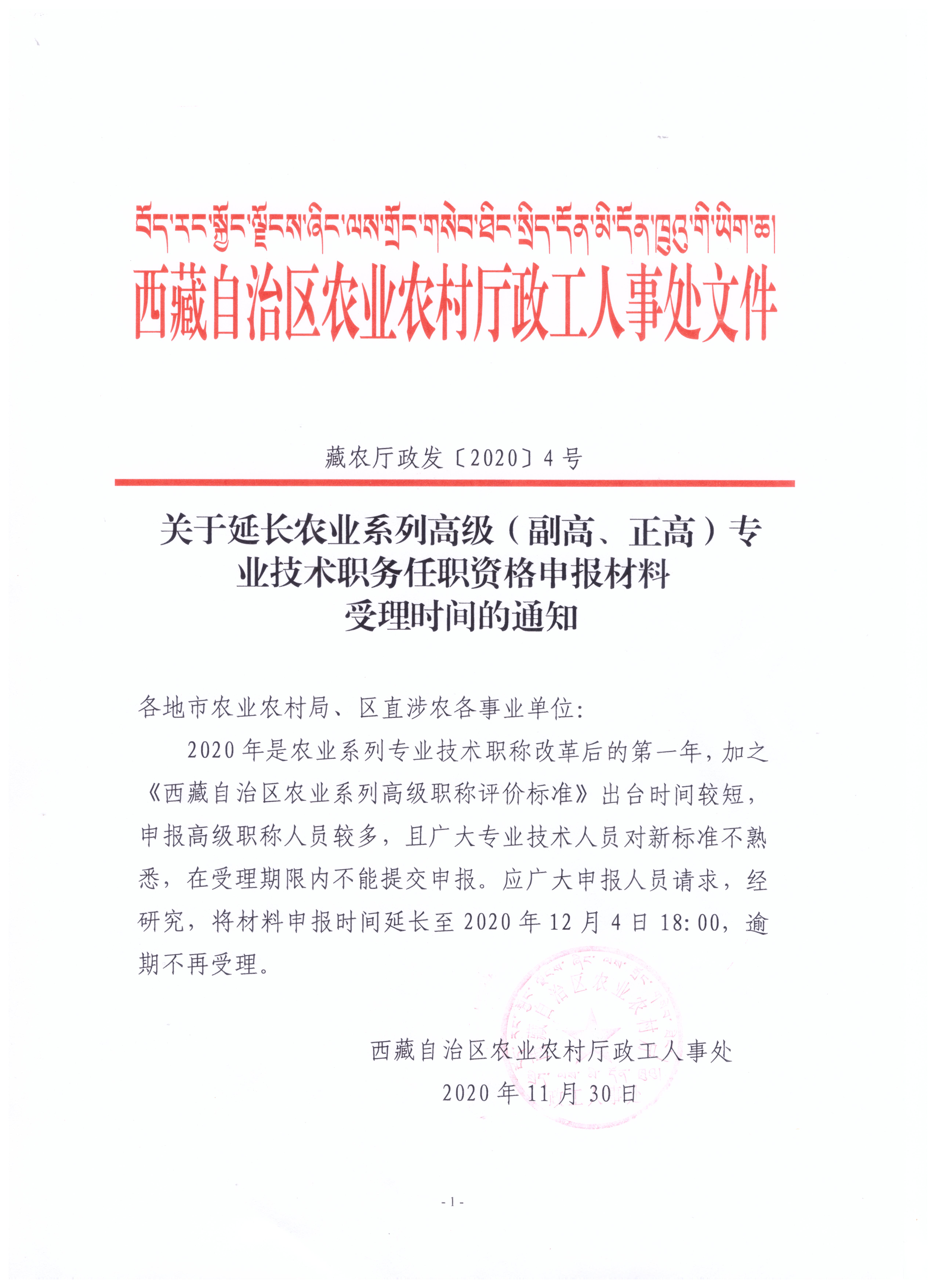 关于延长农业系列高级(副高、正高)专业技术职务任职资格申报材料受理时间的通知